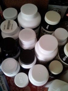 - All of my medicine bottles, both prescription and over-the-counter. This way when a doctor asks how many IU of Vitamin D I take, or how much selenium is in my multivitamin, or a what an unknown item contains, I can just hand her or him the bottle to get the answer. After all, saying I take three calcium pills per day doesn’t mean anything unless I know how much calcium is in each pill. Sometimes I leave home the less necessary ones if my bag is too heavy for me to carry comfortably. There are a lot of bottles.